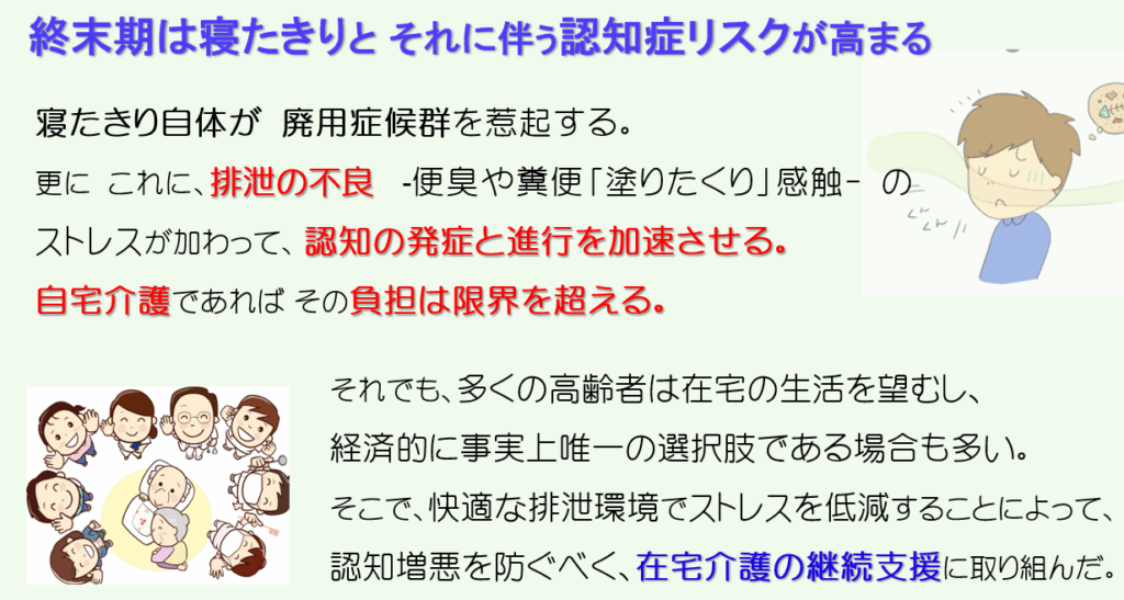 一般の介護者にとって、寝たきりの排泄介護は困難です。結果として、介護施設の逼迫が発生します。介護される側にとっても、オムツ排便の不快や精神的負担は深刻で、それが認知症の発症や進行を加速させる要因となります。