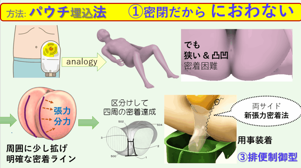 人工肛門のストマを参考に、パウチによるにおい遮蔽を試みました。しかしながら、肛門部は狭く複雑な形状で、肛門部への密着に従来法を適用できませんでした。そこで、肛門から少し離れた範囲を検討して、臀部下の基点と鼠径溝の1点を結ぶ張力を押圧力(密着力)として転換できることに着目しました。シンプルで当たり前なのですが、この分野における新しい密着方法として特許を取得しました。さらに、排便後はパウチ開口部の2本のゴム紐を結び、密閉のままスムーズに廃棄処理に移行する流れです。