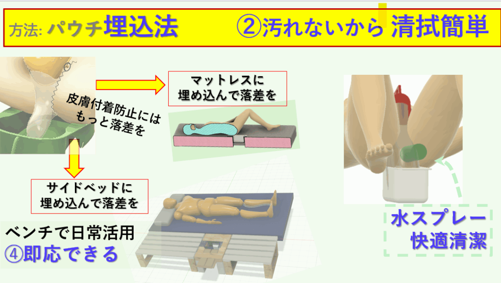 オムツ介護には排泄物が肌に密着する不快と清拭時の便臭拡散があります。パウチにニオイを閉じ込めても、便が肌に付着すれば同じ状況になってしまいます。そこで、付着を防ぐ仕組みとして、ベッドの中にパウチを落とし込む落差を設け、排泄物が肛門周囲に留まらない構造を採用しました。現状で利用可能なのは、穴あきマットレスか、50㎝幅のハーフサイズも穴あきサイドベッドを配置し、移乗して排便する。便付着を最小に留めることができるので、密閉パウチに挿入したノズルからのスプレー水で清拭できます 。