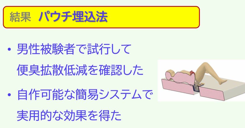 「パウチ埋込パン法」(pouch-embedded pan method, PEP法)として、排便と清拭の両過程に対策を施した。